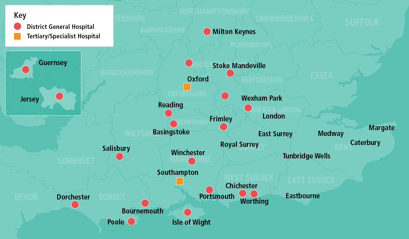 Thames Valley and Wessex Surgery in Children Operational Delivery Network works with 19 different hospitals across 13 different NHS Trusts. Routine surgery for children is provided across all of our hospitals for most types of surgery, with specialist surgery provided at our two specialist tertiary hospitals in Oxford and Southampton. The map shows where these hospitals are located.